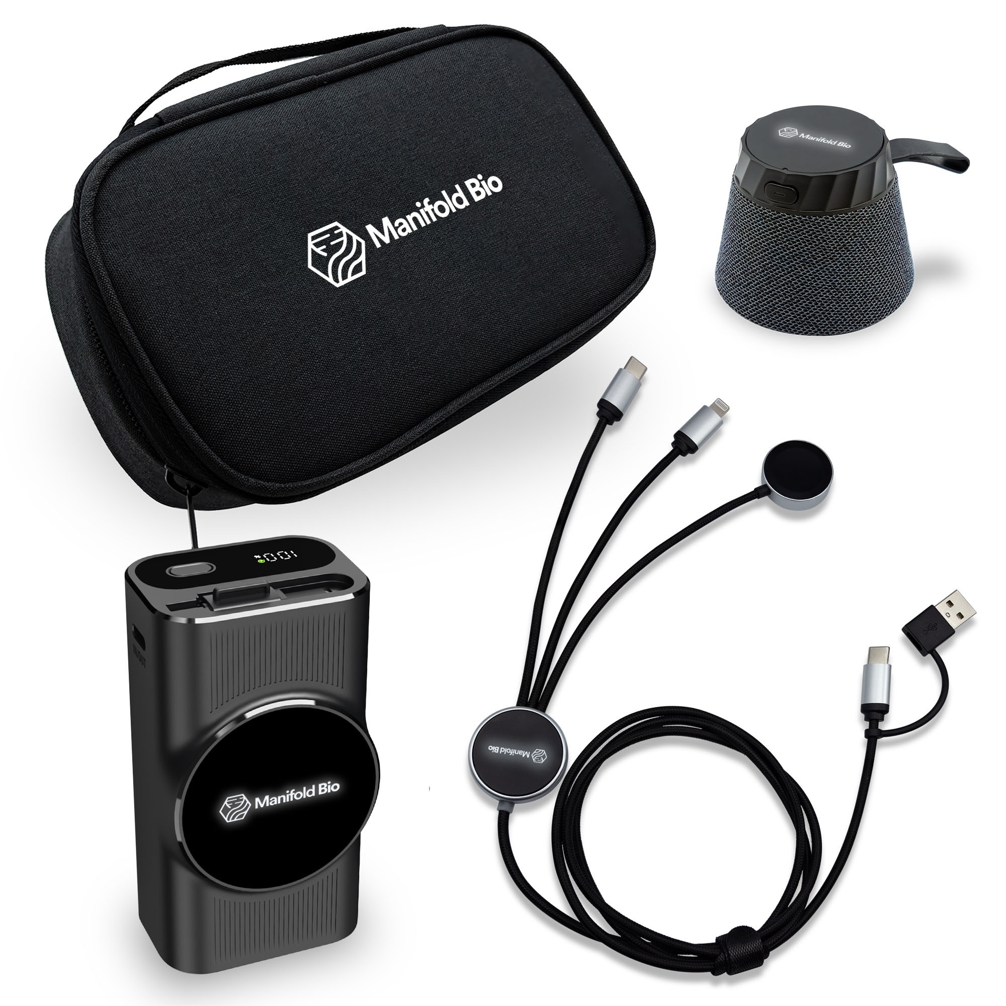 | Imprint Sizes | Power Bank: Dia 7/8" | Speaker: H 7/8" x W 3/4" | Charging Cable: Dia 3/4" | Accessories Bag: H 1 3/4" x W 3 1/2" |