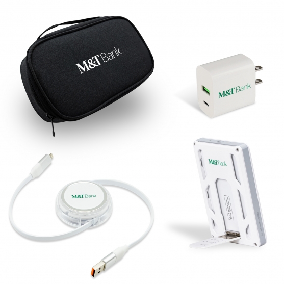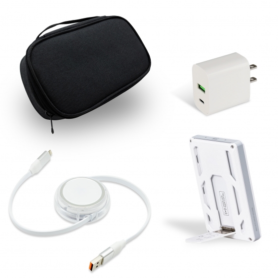 | Imprint Sizes | Power Bank: Back (stand): H 1 1/4" x W 1/2", Front (Qi ring): H 1" x W 1" | Wall Adapter: H 5/8" x W 1 1/4" | Retractable Cable: Dia: 1 1/4" | Accessories Bag: H 1 3/4" x W 3 1/2" |
