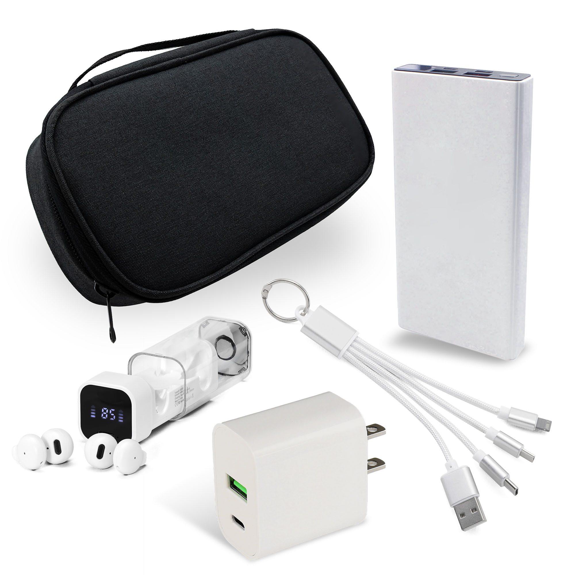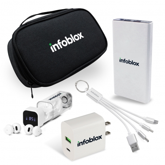 | Imprint Sizes | Power Bank: (Front) H 1 3/4" x W 1 1/2" (Backside) H 1 1/2" x W 3" | Adapter: H 5/8" x W 1 1/4" | Charging Cable: H 5/8" x W 5/16" | Earbuds: H 1/2" x W 1 3/4" | Accessories Bag: H 1 3/4" x W 3 1/2" |
